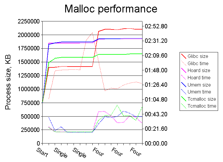 some data from benchmarking glibc's malloc vs Hoard, Umem, and